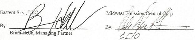 This Business Consulting Agreement is entered into on March 18, 201 lby Midwest Emission Control Corp, a North Dakota Corporation ("Company") and Eastern Sky, LLC a Florida Limited Liability Company ("Consultant")
