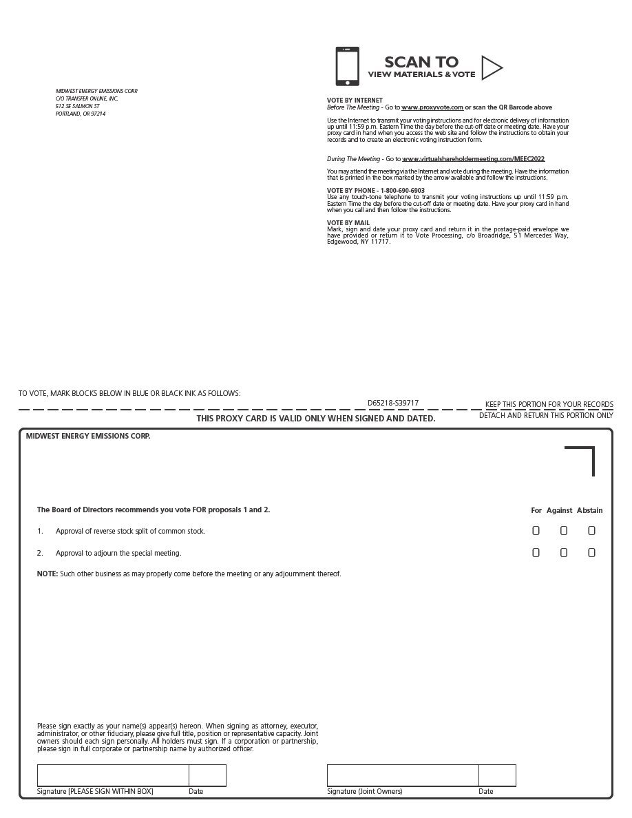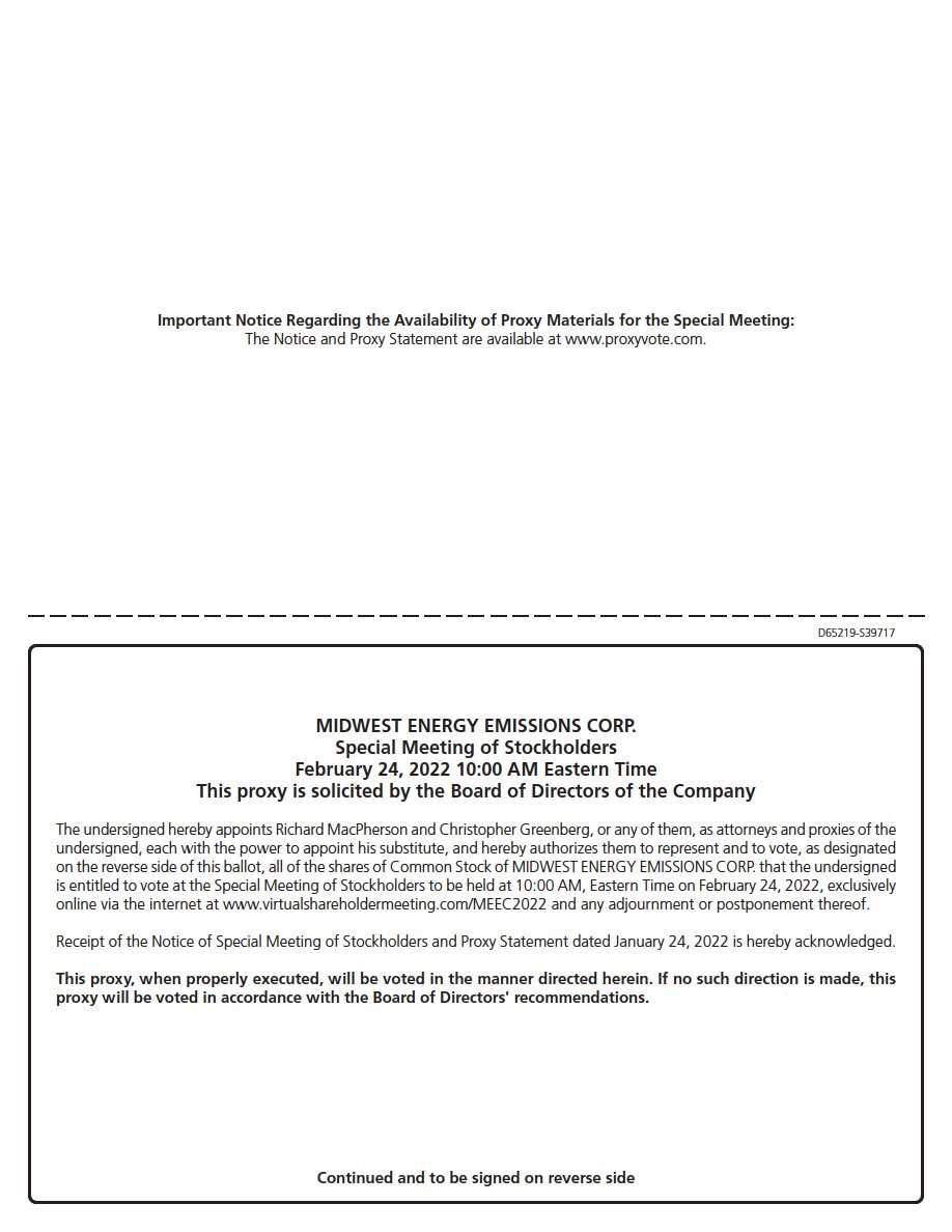 A special meeting of stockholders (the “Special Meeting”) of Midwest Energy Emissions Corp. (the “Company”) will be held exclusively online via the Internet on Thursday, February 24, 2022, at 10:00 a.m. Eastern Time. The purposes of the meeting are: